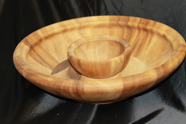 This Bowl Set is made out of Teak Wood with no finish. Can be used as a party bowl, chip and dip bowl, veggie and dip bowl, etc. The center bowl is removable for easy filling and cleaning. Can be used with food. Dimensions of this item are 4.5" tall and a 16" diameter